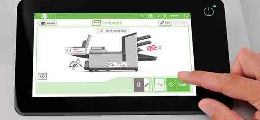 The 7” color touch screen and wizard-based guidance simplify operation. Quickly recall up to 50 stored jobs or create new ones with ease. Load documents and envelopes, press start, and the DS-64i automatically measures the materials and sets itself up